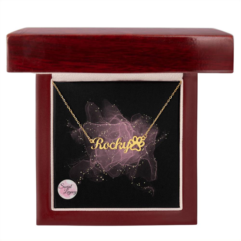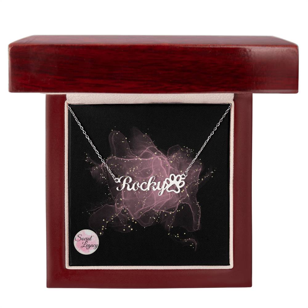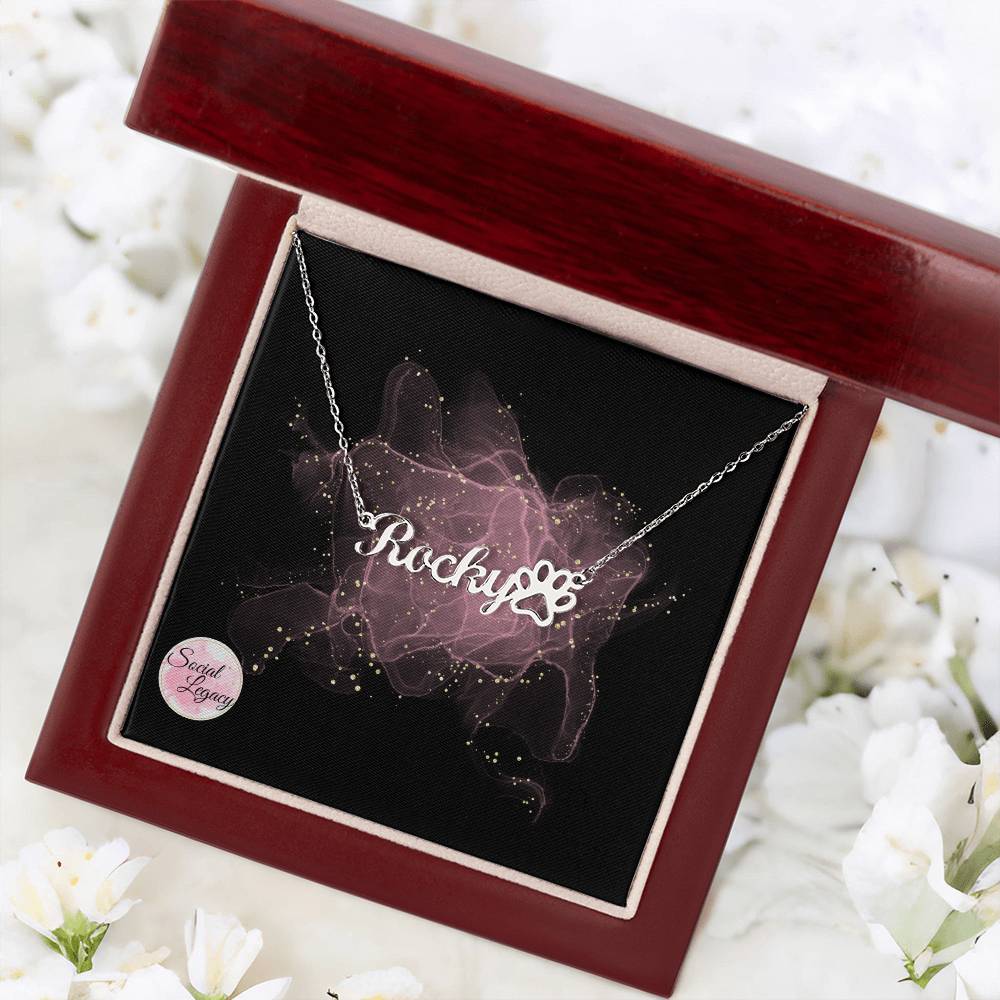 This stylish necklace features a cursive name design and paw print symbol suspended on a 16”-18” adjustable cable chain, making it both personal and beautiful! Your necklace will be custom made upon ordering in the name or word of your choice, with up to 10 characters. It's a gift they will surely want to keep close to their heart forever!